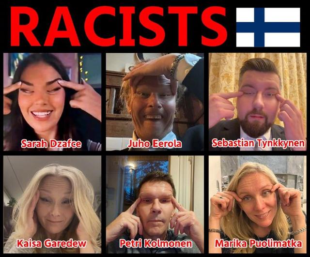 前“芬兰小姐”(左上)和多名芬兰政客做出歧视性动作